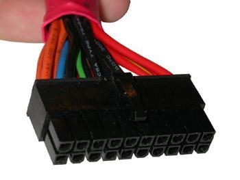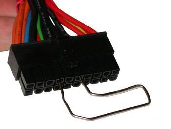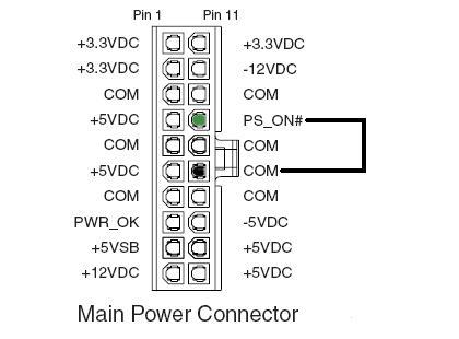 Avouez donc que démarrer son alimentation sans la connecter à la carte mère vous rendrait de grands services. Et bien, c’est très simple à réaliser ! Il suffit de relier la pin 14 (appelé PS_ON#) a la pin 16 (appelé COM c'est-à-dire là masse). De manière plus élémentaire, c’est le fil vert au fil noir.